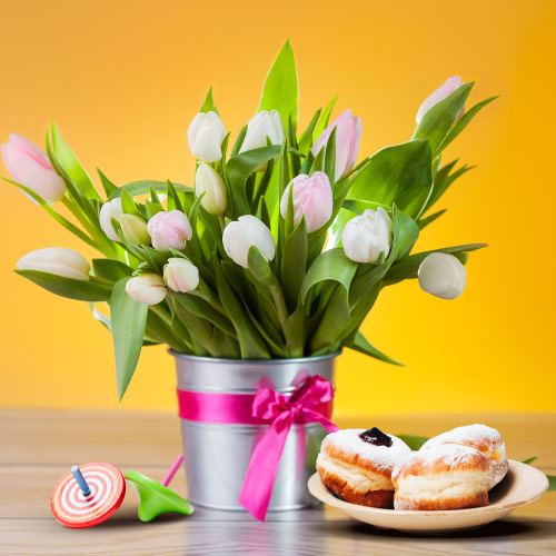 סידור פרחים במרכז שולחן החג, מוסיף חגיגיות ועומק למראה השולחן, ובחנוכה נבחר כאמור בצבעים שמחים וחזקים. ליד החנוכייה המאירה, מטבעות השוקולד, הלביבות הריחניות והסביבונים, נשלב סידור פרחים מרשים ממגוון פרחי החורף כגון כלניות, נוריות וטוליפים